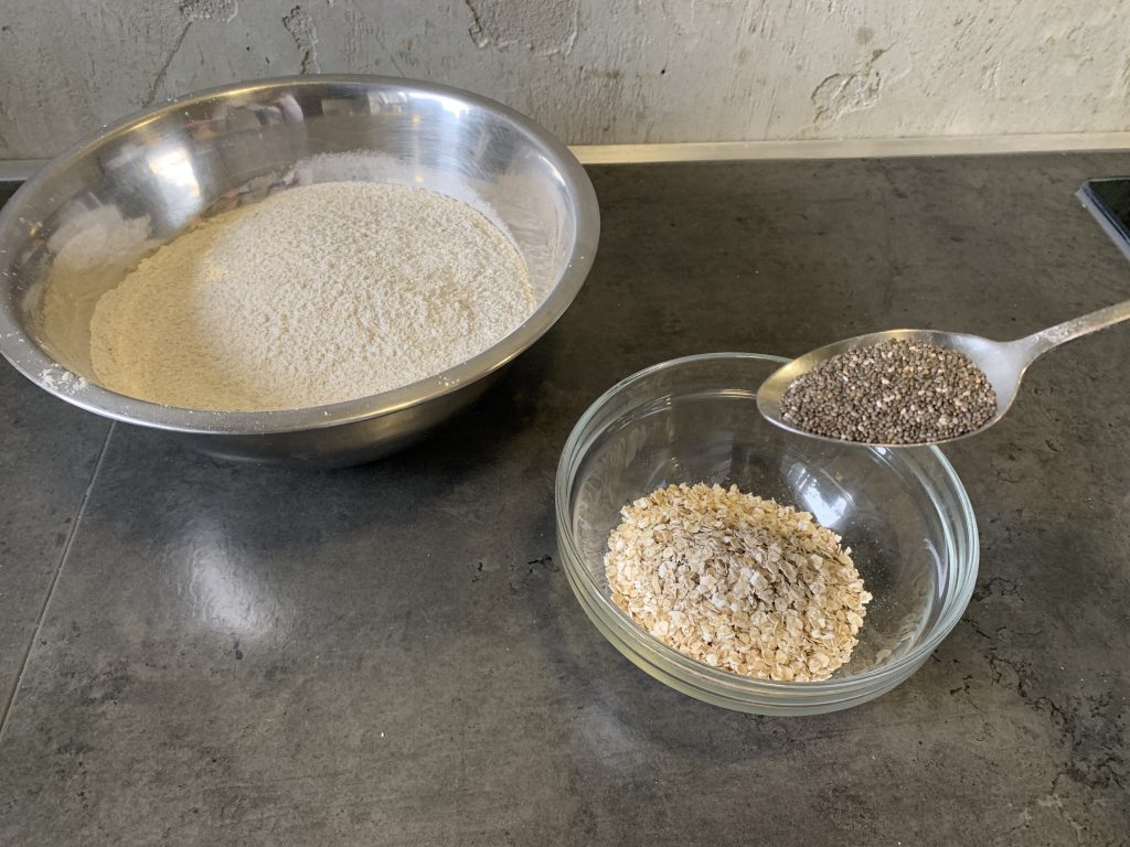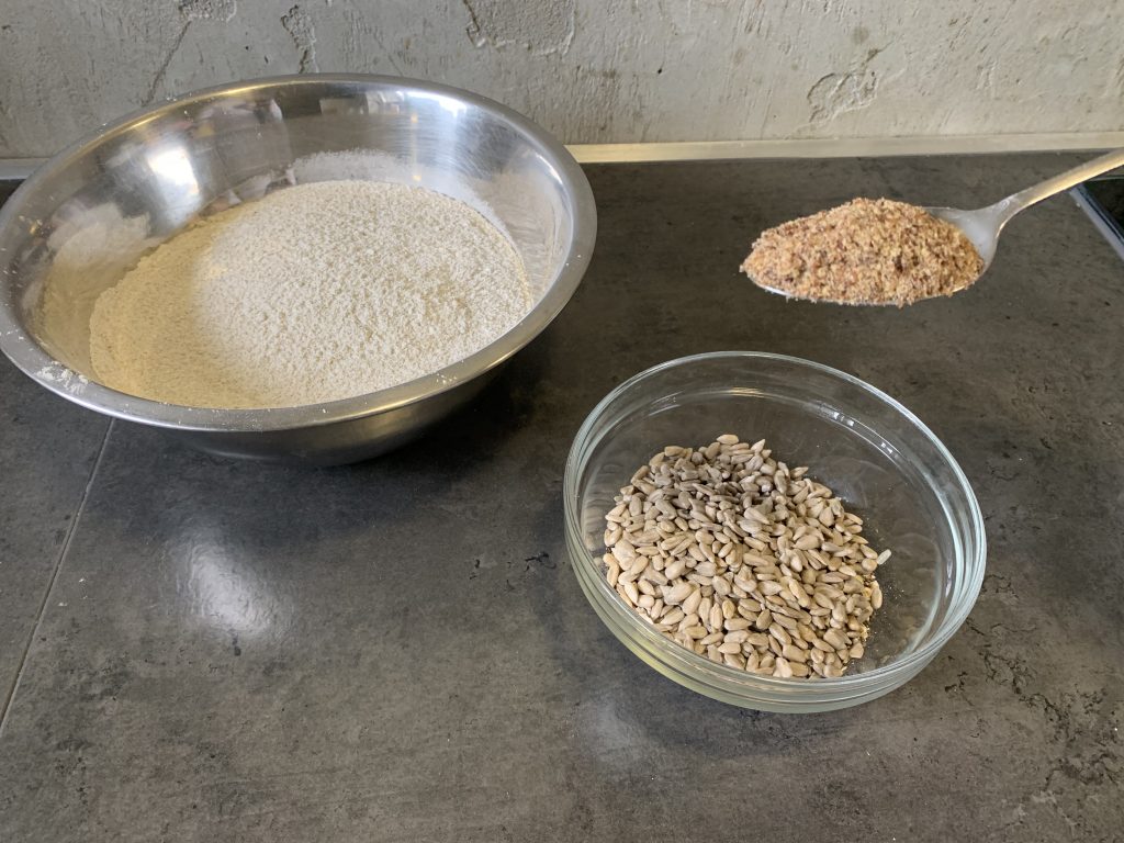 - Ziarna: 3 łyżki płatków owsianych, 2 łyżki słonecznika, 2 łyżki siemienia lnianego, 1 łyżka nasion chia